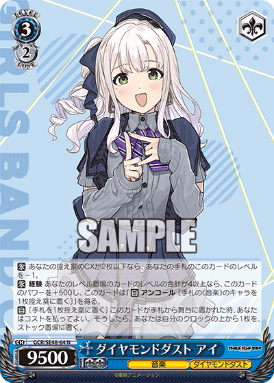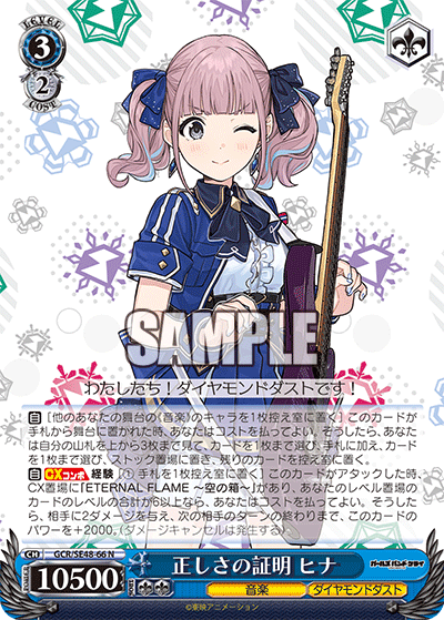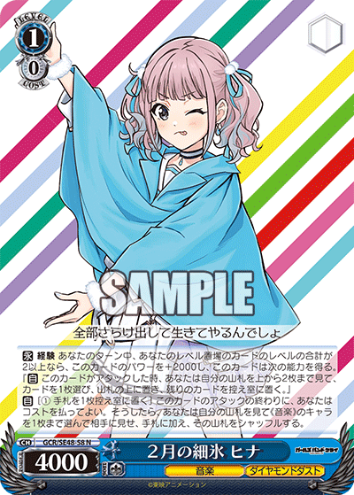 For the name… well, both of the combos are Diamond Dust, but I don’t think it’d be a different deck if you switched to a different level 1 combo. The concept of being a fairly standard deck but (hopefully) doing it well/efficiently does kinda fit, though. With it being a more defensive deck, that could play off of diamonds’ hardness somehow… though the “dust” part doesn’t work too well with that, I suppose. Something to do with healing? Hmm, the Rupa EP’s card name mentions not being alone, so could play off of that with the idea being to play more than one EP. “一人じゃないEP”; yeah, I’ll go with that. Or wait, maybe I should make “EP” plural there. It also still sounds like “not alone”; while this is based on the card name, it’s trying to say something slightly different, more like “not just one”. So: “一人だけじゃないEPs”.
