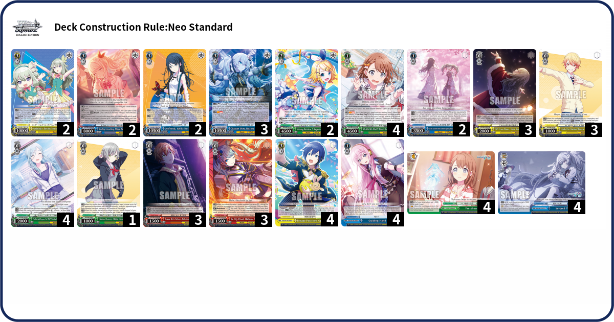 With Project Sekai coming out in English (or “HATSUNE MIKU: COLORFUL STAGE!” as it’s called officially), I figured I’d make a post about the deck I played when it came out in Japanese. I won a couple locals with it, so I think it’s at least decent; of course, that was a couple years ago at this point.