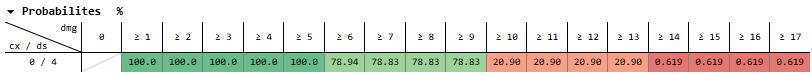 One nice thing about everything being 4s here in this simplified scenario is that it limits the number of different probabilities we have to deal with, since there’s a hard cutoff at multiples of 4 (plus 1 for the refresh penalty). The most interesting damage numbers are the 6-9 range and the 10-13 range, so I’ll just look at those. (I suppose there’s a slight chance of a second refresh penalty, hence the higher numbers for 6 and 10 in some cases, so really I’ll focus on 7-9 and 11-13.)