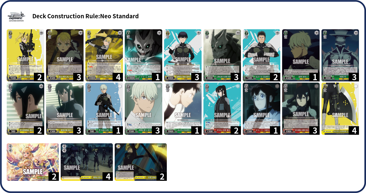 Following up on my initial Kaiju No. 8 post, the first thing I wanted to try out was the choice topend. I was curious whether going for 2-soul climaxes with no level 1 combo would actually work… and so far, it seems like it does. In the tests I’ve done, it’s been pretty consistent about getting the combo off, and it’s generally been milling into a deck averaging slightly more than a soul trigger per card.